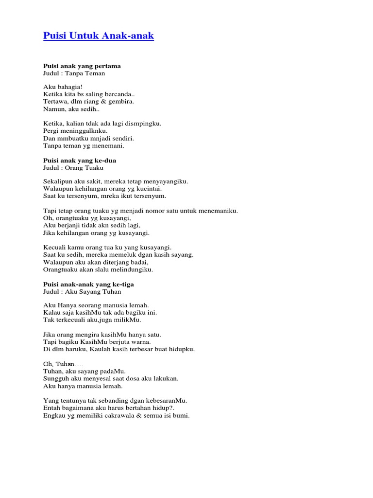 Terutama orang dewasa kadangkala mereka harus belajar banyak tentang kehidupan dari seorang anak yang lugu dan polos. Puisi lama masih terikat dengan jumlah baris bait ataupun rima sajak. Dalam penulisan puisi tersebut ada beberapa hal yang harus dipertahankan dalam proses penyusunannya salah satu diantaranya adalah mengatur irama disetiap kata-kata yang.