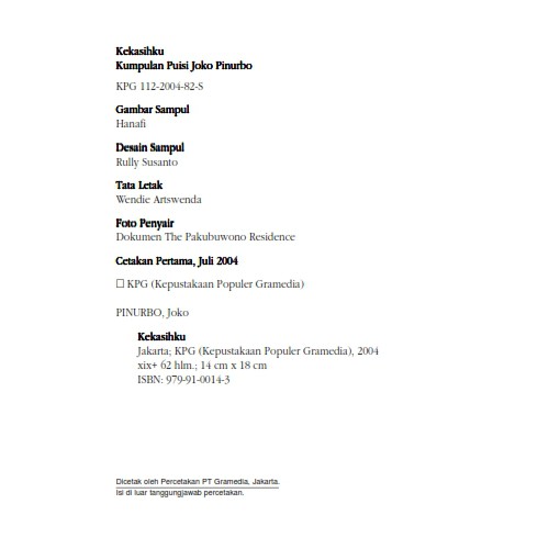 Joko Pinurbo bahkan juga memasukkan anggota badan seperti mata kepala wajah bibir dan lain-lainnya sebagai simbol dalam puisi-puisinya. Perkenalan lebih jauh dengan puisi-puisi tersebut menyingkapkan sesuatu yang lain yaitu ternyata Joko Pinurbo adalah seorang penyair yang sangat seriusJoko Pinurbo atau biasa dipanggil Jokpin mengaku dalam buku kecil ini telah menyair sekitar 20 tahun dihitung pada 1999. Pada puisi KK Joko Pinurbo mencoba merangkai sebuah kamus yang berisi kata dengan bentuk mirip tapi saling berhubungan misalnya pada bait pertama baris ke-5 kisah dan kasih merupakan hubungan saling mendukung baris ke-11 gagah dan gigih merupakan hubungan syarat dan baris ke-13 hantu dan Tuhan merupakan.