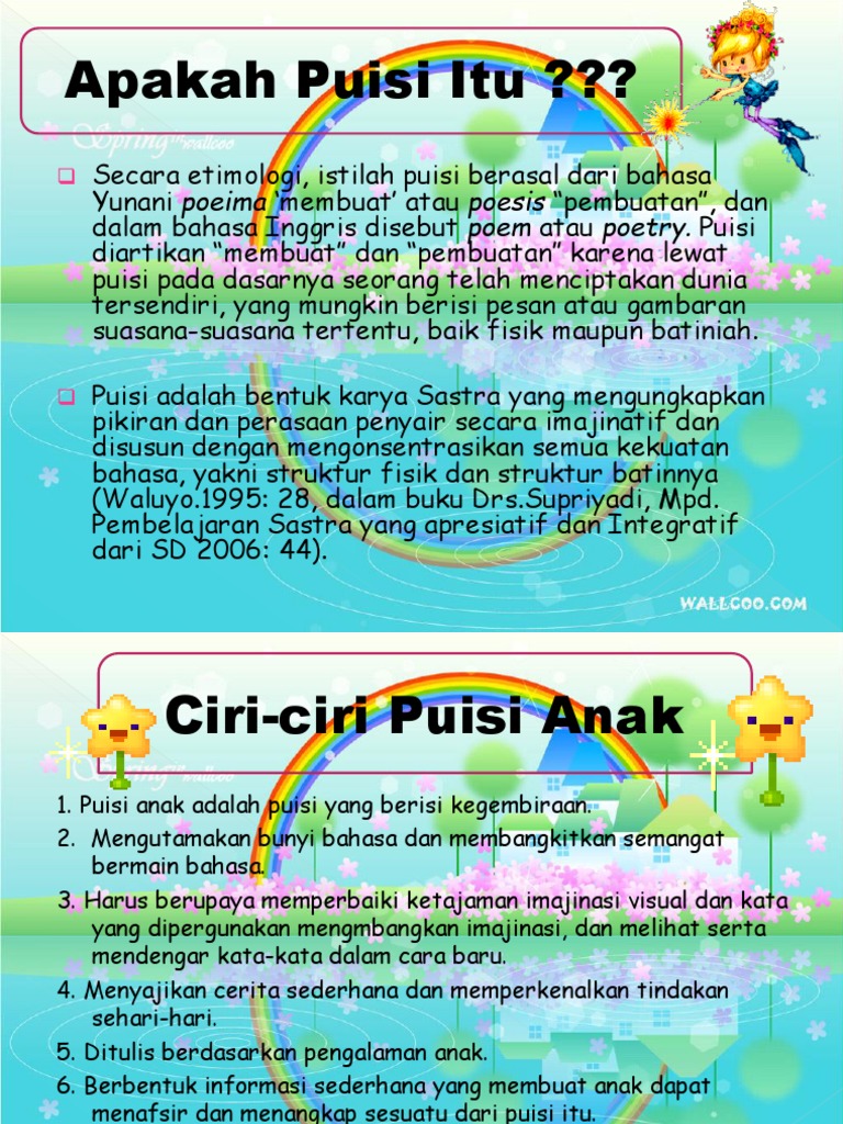 Puisi anak ditulis berdasarkan pengalaman. 3 mengemukakan bahwa puisi itu lebih merupakan pernyataan perasaan yang bercampur-baur. A short summary of this paper. Pendek atau panjang nyata atau fiktif dan nasihat atau cerita kembali kepada kehendak dan kreativitas penulis.