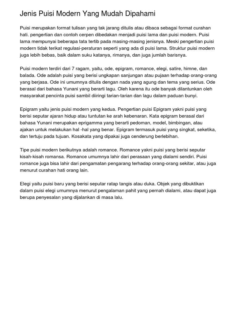 Nov 06 2019 Pelayananpublikid-Siapa yang tak kenal puisi untaian kata-kata indah yang ditulis dan bisa menggtarkan hati pembacanyaPuisi saat ini sangat bebas dibuat bahkan oleh anak SD sekalipun. Puisi ditulis berdasarkan pengalaman jiwa atau berdasarkan kehidupan nyata. Terlebih saat ini sudah banyak contoh puisi anak yang sudah ada di buku dan internet.