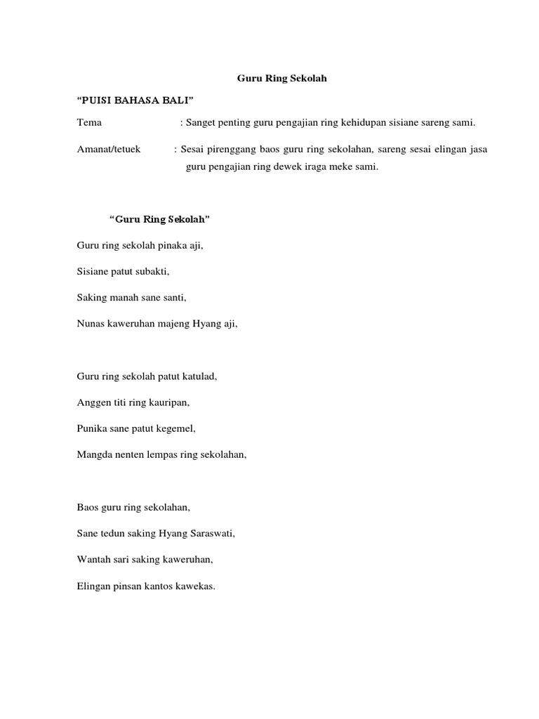 Contoh puisi bali anyar tema pendidikan. Puisi Bali Anyar Puisi Bali Anyar punika wantah sastra sane kaangge nartaang pabesen ngangge basa sane bawak nanging dagingne. Inilah contoh puisi bali anyar tema pendidikan dan ulasan lain mengenai hal-hal yang masih ada kaitannya dengan contoh puisi bali anyar tema pendidikan yang Anda cari.
