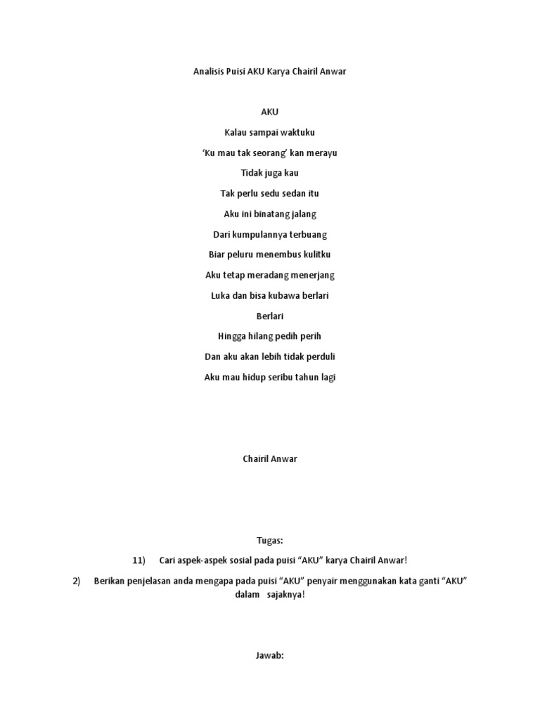 Mar 11 2021 Puisi aku karya chairil anwar peneliti hanya menganalisis unsur intrinsiknya saja. Aug 23 2020 Puisi ini ditulis oleh Chairil Anwar pada tahun 1949 yang berperan sebagai puisi penutup pada antologi puisinya yang sang at bagus dan terkenal berjudul Aku Ini Binatang Jalang. Puisi Aku Chairil Anwar.